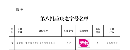 5月30日,重慶市商務(wù)委員會正式發(fā)布了《關(guān)于認(rèn)定第八批重慶老字號的通知》(渝商務(wù)〔2025〕160 號),市農(nóng)投集團(tuán)所屬天友乳業(yè)“天友”品牌位列其中。
